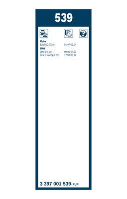 Щітка двірника від BOSCH, арт. 3397001539 може бути застосовано у таких авто: BMW 5 Sedan, BMW 5, BMW 5 Touring, ALPINA B10, ALPINA B10 Touring, ALPINA D10, ALPINA D10 Touring