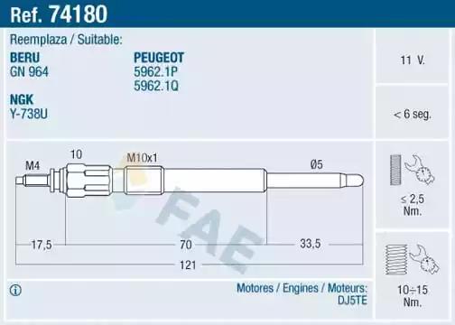 Свічка розжарювання від FAE, арт. 74180 може бути застосовано у таких авто: CITROËN RELAY I Автобус, PEUGEOT BOXER Автобус, PEUGEOT BOXER FURGON Фургон, CITROËN RELAY I Фургон, PEUGEOT BOXER Платформа/шасі, CITROËN RELAY I Платформа/шасі