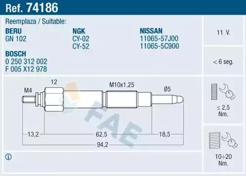 Свічка розжарювання від FAE, арт. 74186 може бути застосовано у таких авто: NISSAN PULSAR V Sedan, NISSAN PULSAR V, NISSAN SENTRA III, NISSAN PULSAR III, NISSAN TSURU III, NISSAN PULSAR V Liftback, NISSAN PULSAR V Hatchback, NISSAN SENTRA III Hatchback, NISSAN SUNNY Mk III Hatchback, NISSAN SABRE III Hatchback, NISSAN TSUBAME III Traveller, NISSAN SUNNY III Break, NISSAN SUNNY Mk III Traveller, NISSAN SENTRA / TSUBAME III Traveller, NISSAN PRIMERA, NISSAN PRIMERA Break, NISSAN PULSAR VI Hatchback, NISSAN PULSAR I Hatchback, NISSAN ALMERA Hatchback, NISSAN PULSAR I Sedan, NISSAN PULSAR I, NISSAN SENTRA I, NISSAN ALMERA I, NISSAN SABRE I, NISSAN PRIMERA Hatchback, NISSAN Q BIC III Фургон/універсал